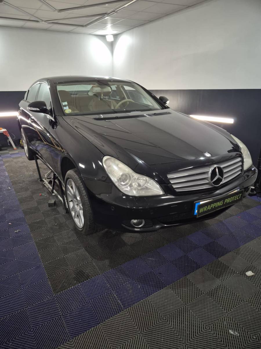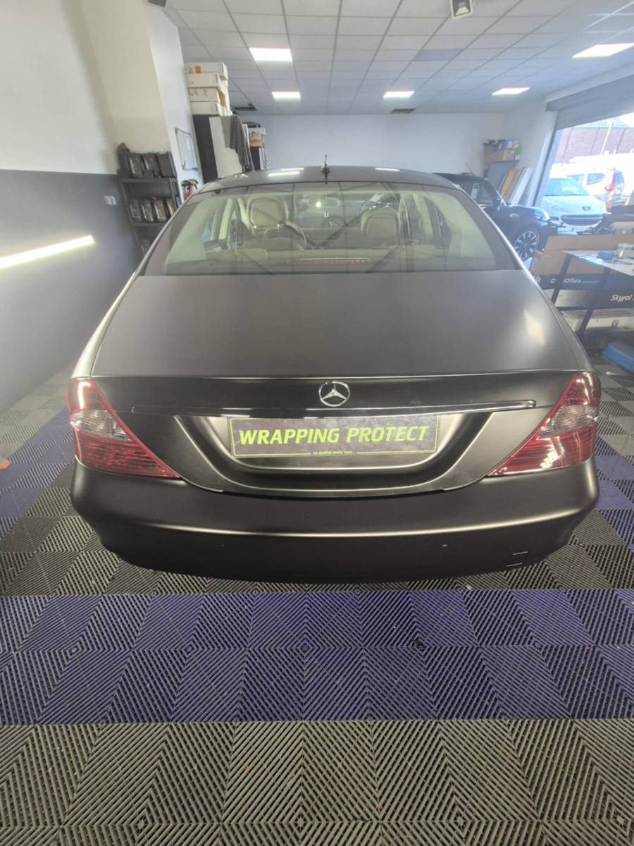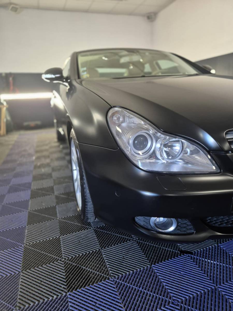 Covering noir satin, déchromage complet, feux teintés et traitement céramique sur Mercedes Benz CLS.