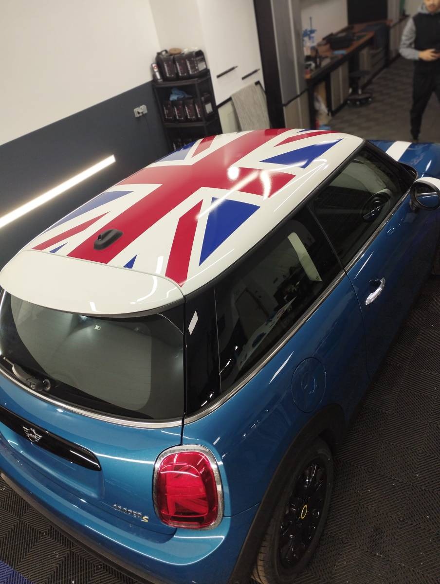 Ce projet a été réalisé pour la concession Mini-store située au 171 bd Graville, 76600 le Havre . Ce véhicule a été vendu et avant la livraison, le client souhaitait personnaliser sa futur voiture afin de la rendre plus attractive en choisissant de poser un drapeau de l'angleterre sur le pavillon ( pays originaire de la marque ).