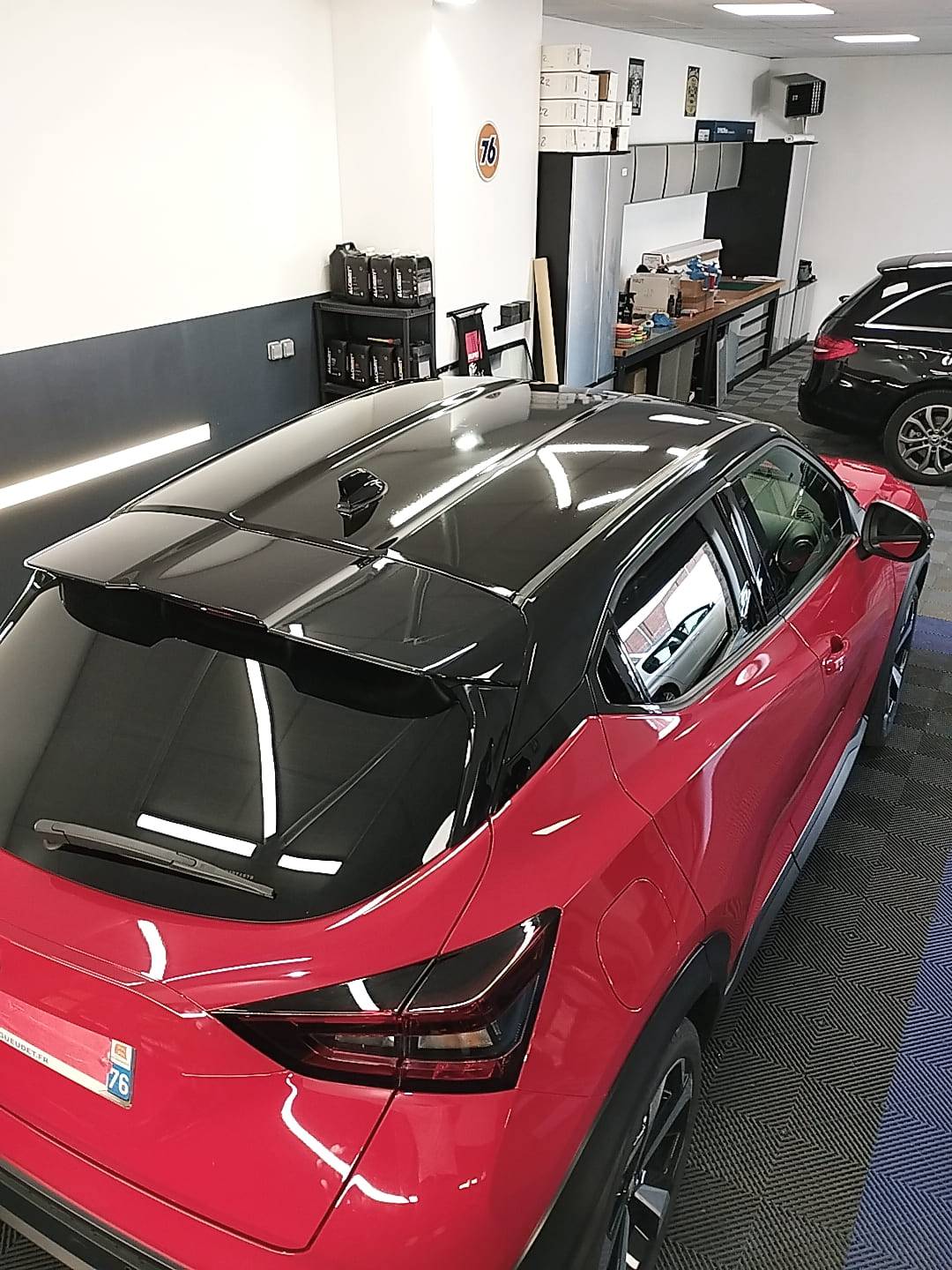 Covering noir brillant sur le toit et haut d'aile arrière sur un NISSAN juke rouge.
