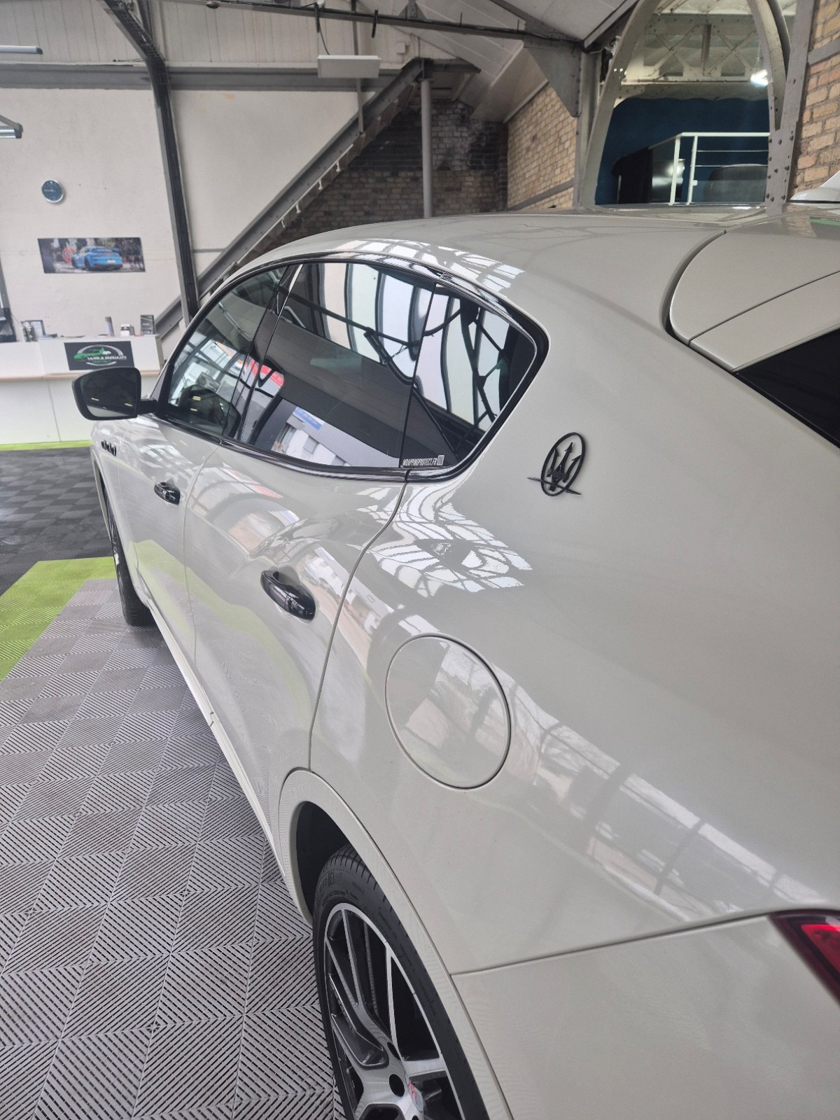 L’intervention consiste à recouvrir l’ensemble des parties chromées — contours de vitres, calandre, logos, baguettes et détails extérieurs — avec un film covering premium noir brillant ou satiné, selon le rendu souhaité par le client. Cette technique permet de moderniser instantanément le véhicule tout en renforçant son caractère sportif et exclusif. Le contraste obtenu met en valeur les lignes du Maserati Levante, lui offrant une allure plus agressive et contemporaine.