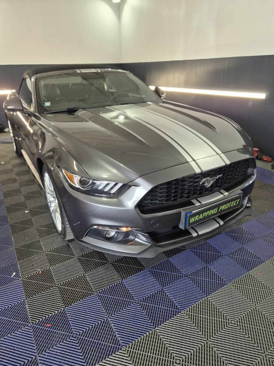 Covering de trois bandes grises sur le capot d'une Ford Mustang à Le Havre.